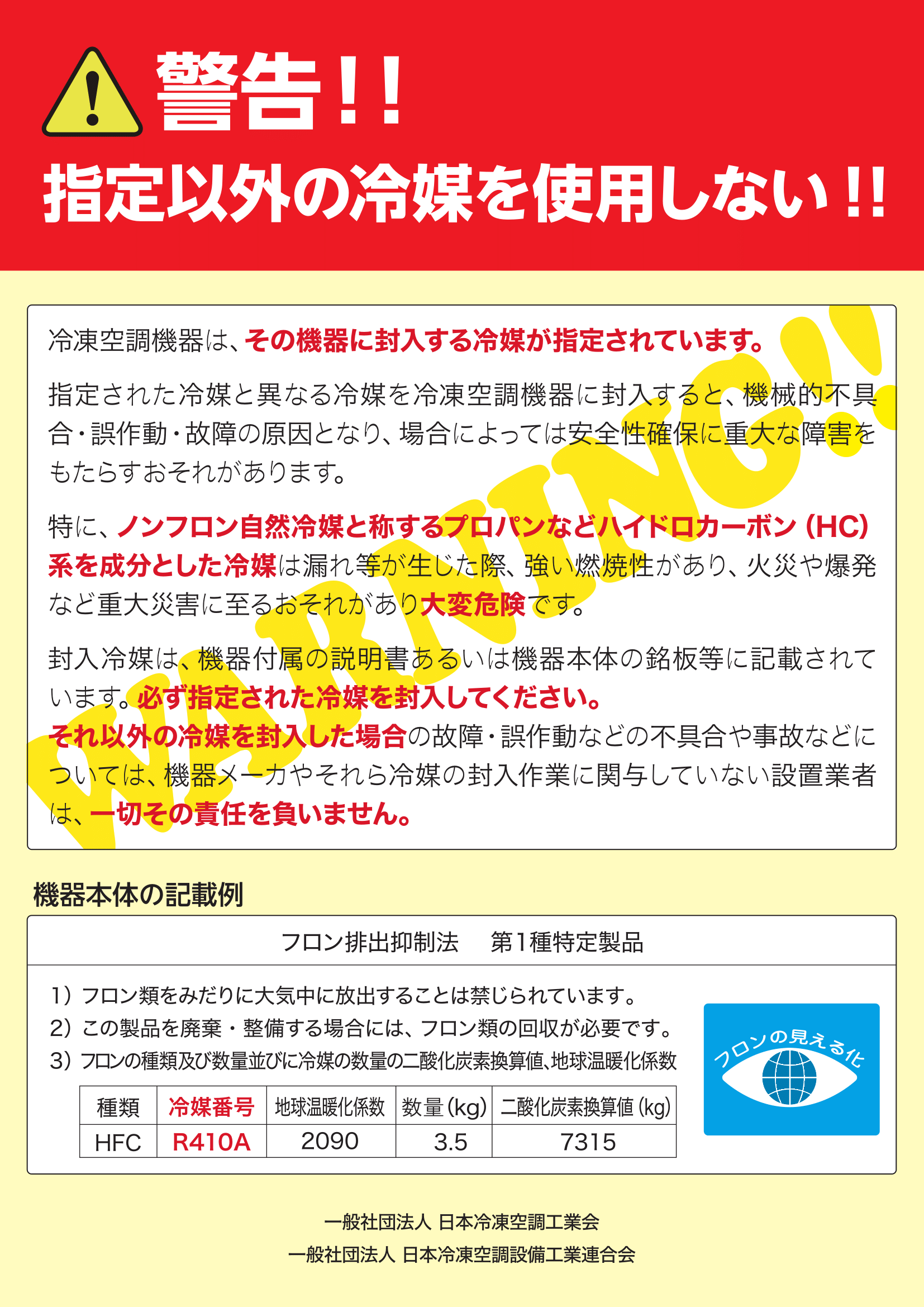 ●警告!!指定以外の冷媒を使用しない!!(指定された以外の冷媒を使用すると・・・)